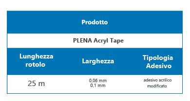 Plena Acryl Tape è un nastro adesivo unilaterale armato, dotato di una superficie superiore impermeabile e traspirante e di un adesivo acrilico modificato ad alte prestazioni.